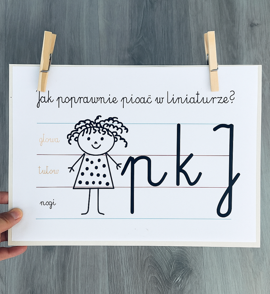 Zestaw (plakaty i wklejki) wspierający naukę pisania w liniaturze. Dzięki prostym i przejrzystym kartom, dzieci łatwiej zrozumieją, jak prawidłowo umieszczać litery w poszczególnych częściach linii: głowie, tułowiu i nogach.