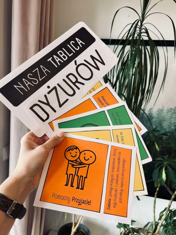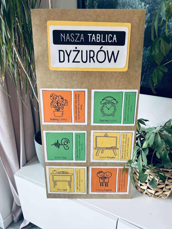 W ramach opłaty otrzymasz plik pdf, dzięki któremu stworzysz tablicę dyżurów. W skład materiału wchodzi: